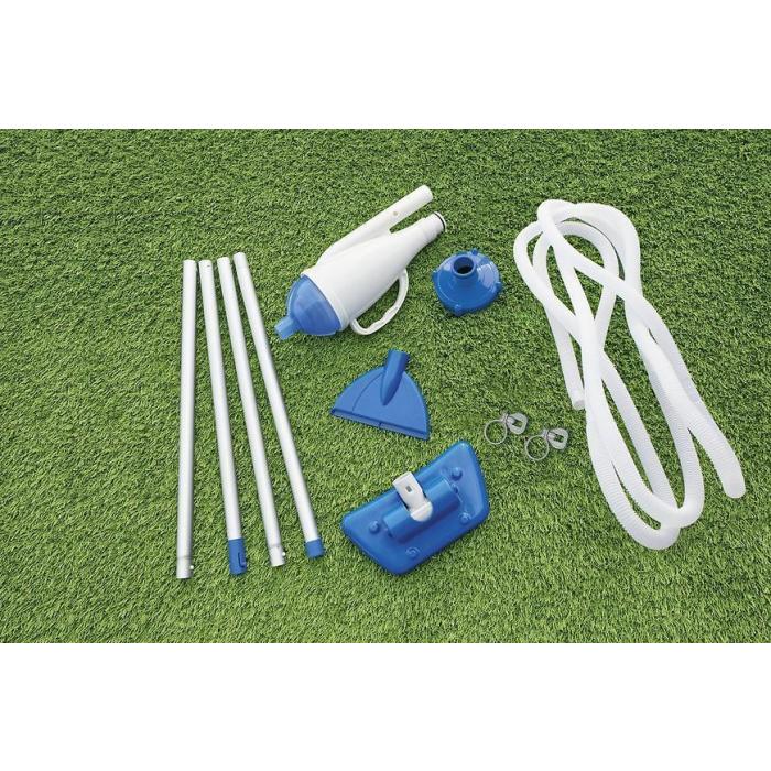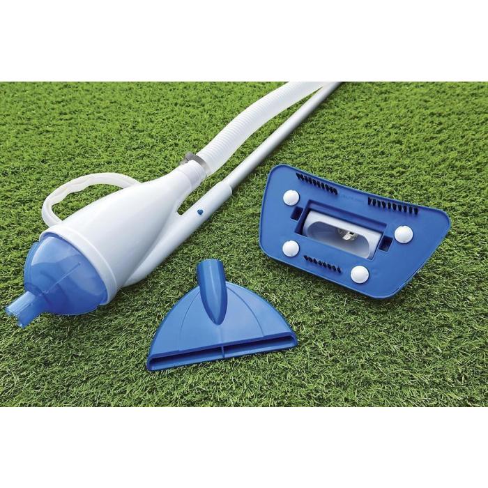 Odkurzacz Bestway® AquaCrawl ™ łatwy w obsłudze podłączony do pompy filtrującej za pomocą jednego z dołączonych adapterów z dwoma wymiennymi dyszami do tego samego drążka: jedna ze szczotką do uporczywego brudu, a druga ze standardową głowicą odkurzającą do basenu.