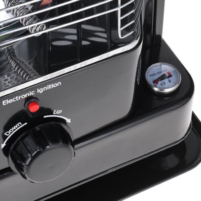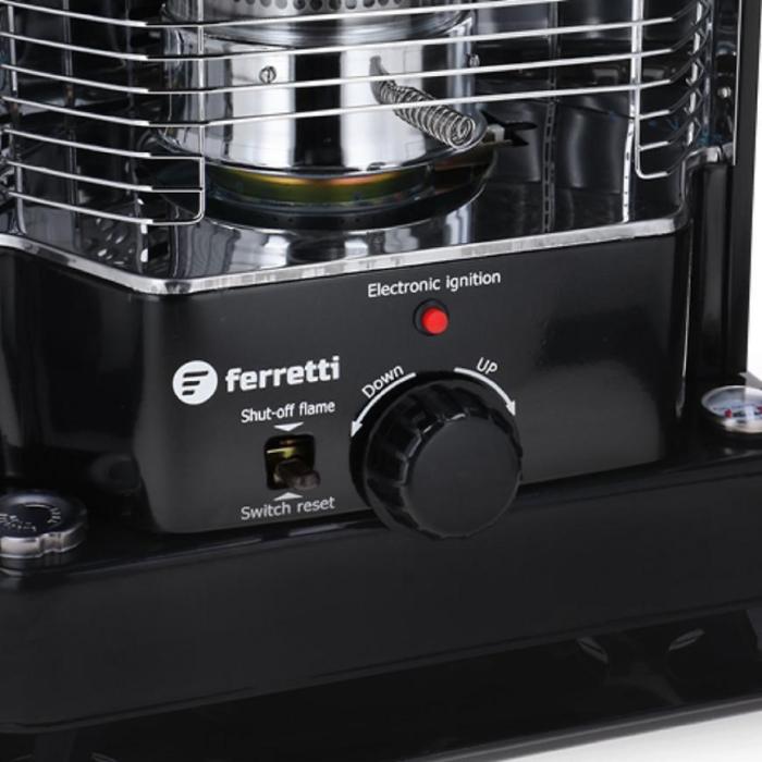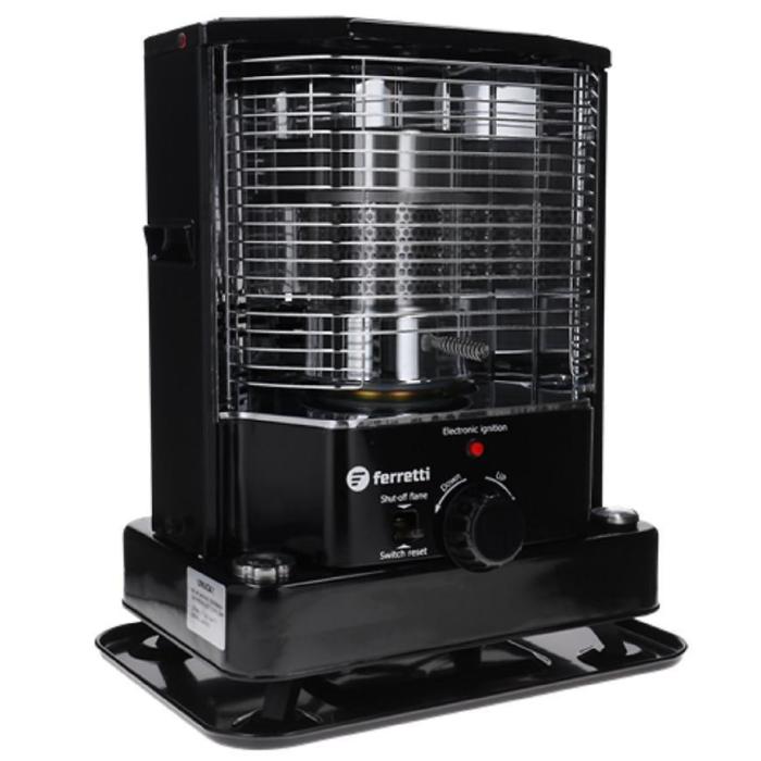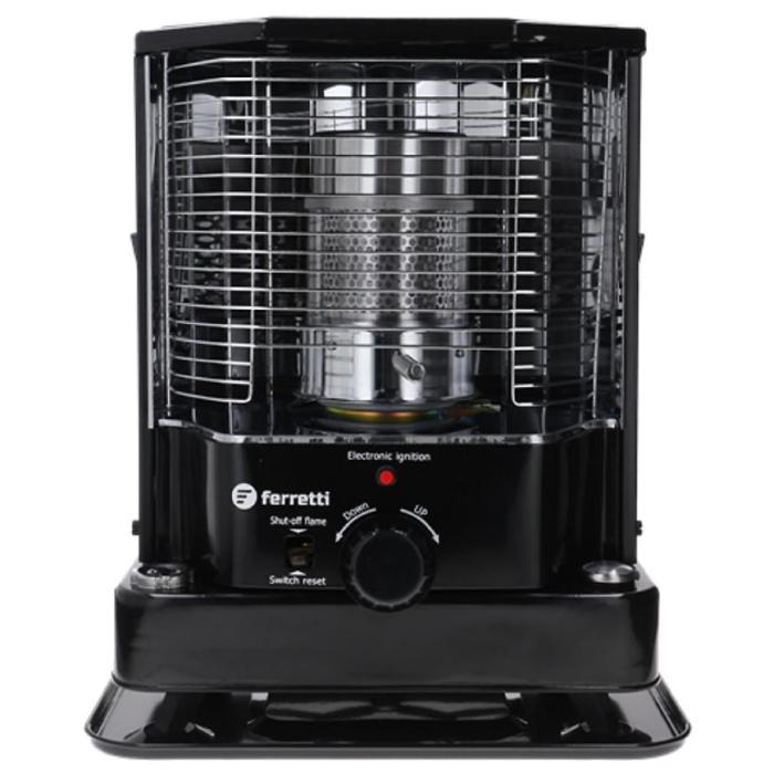 Ogrzewacz naftowy FRN-2400 o wymiarach 42x31x51 cm wyposażony jest w wbudowany termostat, dzięki któremu w łatwy sposób dopasuje temperaturę do swoich potrzeb. Piecyk posiada podwójny zbiornik o pojemności 4.2l co pozwala na maksymalny 13 godzinny cykl pracy. Maksymalnie zużycie to 0,26l paliwa na godzinę. Piecyk posiada szklany komin, zapalarkę elektroniczną oraz zabezpieczenie przed przewróceniem.