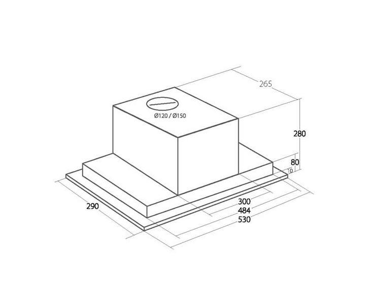 Moc silnika wynosi 126 W, całkowita moc 130 W, a głośność pracy mieści się w zakresie 43–65 dB. Średnica przewodu wentylacyjnego to 150/120 mm, oświetlenie zapewniają 2 diody LED, sterowanie jest elektroniczne, a klasa efektywności energetycznej: C.