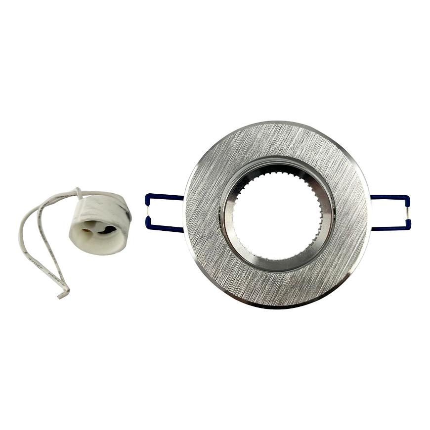 Elegancka oprawa 2w1 w srebrnym, szczotkowanym wykończeniu, o dużym, okrągłym kształcie i średnicy 9 cm. Wykonana z trwałego aluminium, łączy nowoczesny design z wysoką odpornością na uszkodzenia.