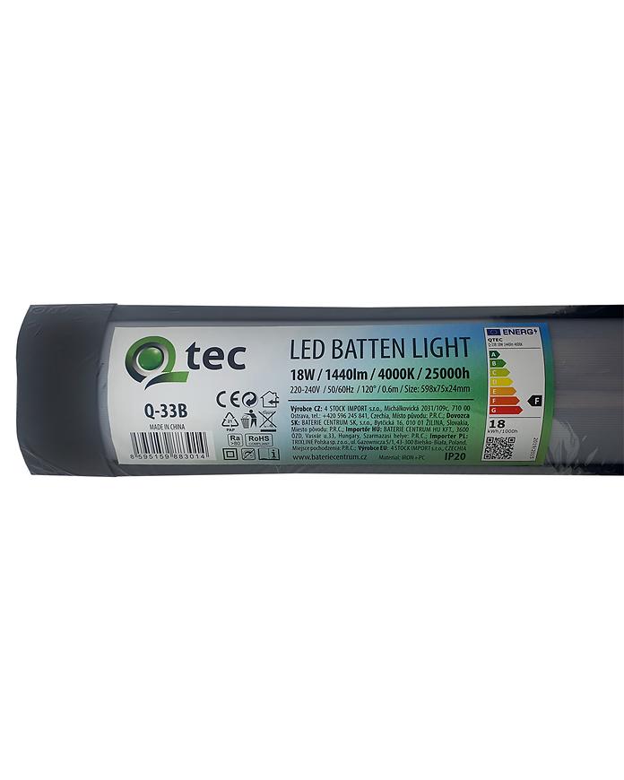 Oprawa Batten LED Q-33B o mocy 18W emituje neutralne białe światło (4000K), gwarantując równomierne i komfortowe oświetlenie wnętrz. Liniowy kształt i czarne wykończenie nadają jej nowoczesny charakter, pasujący do minimalistycznych aranżacji. Wykonana z metalu i tworzywa sztucznego, trwała i solidna. Produkt nieprzyciemnialny, bez możliwości zmiany kierunku świecenia.