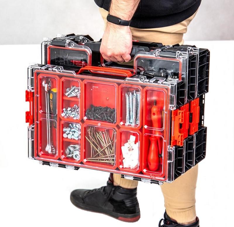 Wyróżniający się kontrastowy design w kolorze czarnym i czerwonym nie tylko nadaje organizerowi dynamicznego wyglądu, ale także ułatwia szybkie odnalezienie potrzebnego narzędzia. Wykonany z trwałego połączenia plastiku, poliamidu i poliwęglanu, zapewnia nie tylko wytrzymałość, ale także lekkość, co ułatwia przenoszenie.