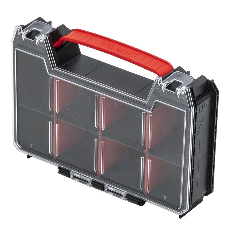 Wyróżniający się kontrastowy design w kolorze czerwonym i czarnym nie tylko nadaje organizerowi dynamicznego wyglądu, ale także ułatwia szybkie odnalezienie potrzebnego narzędzia. Pokrywa z poliwęglanu chroni narzędzia przed warunkami atmosferycznymi, co czyni go idealnym rozwiązaniem zarówno do użytku w warsztacie, jak i na zewnątrz.
