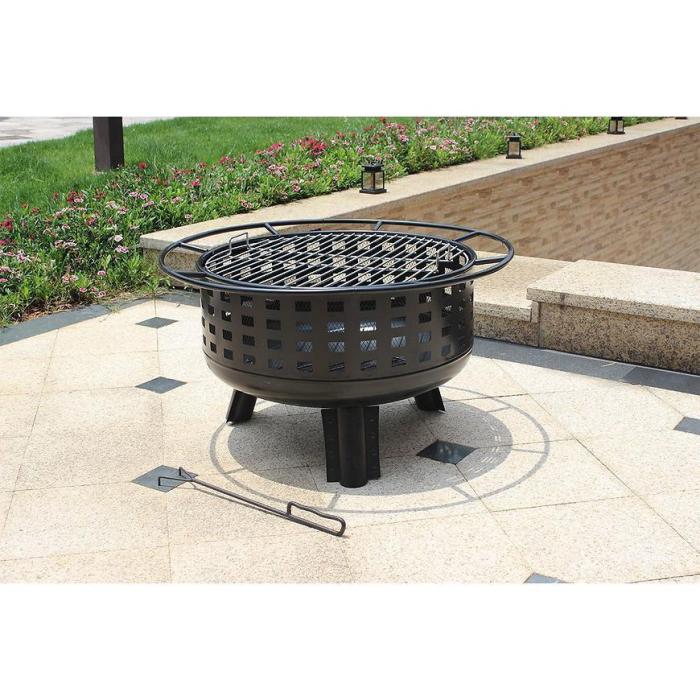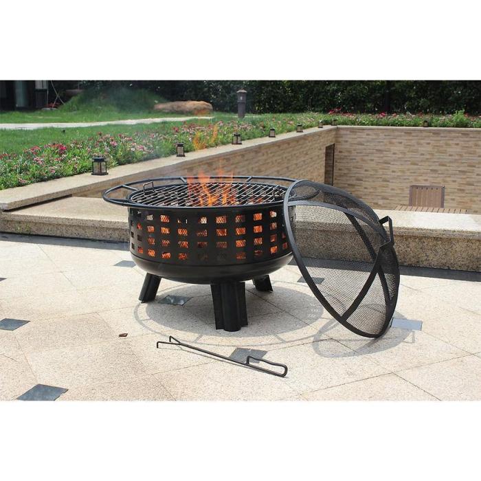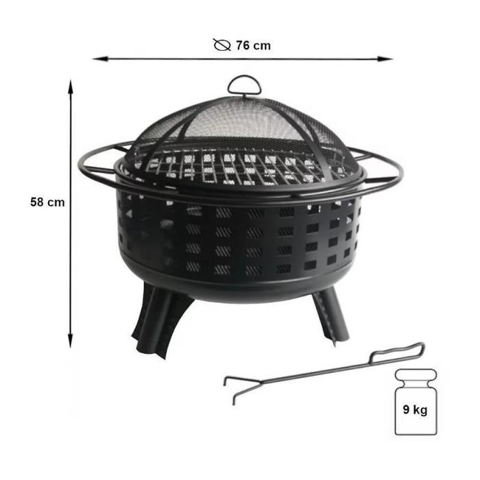 Palenisko wykonane jest ze stali oraz wyposażone w siatkową pokrywę ochronną, która zabezpiecza przed iskrami i zwiększa bezpieczeństwo. W zestawie znajduje się hak ogniskowy/pogrzebacz ułatwiający podnoszenie pokrywy.