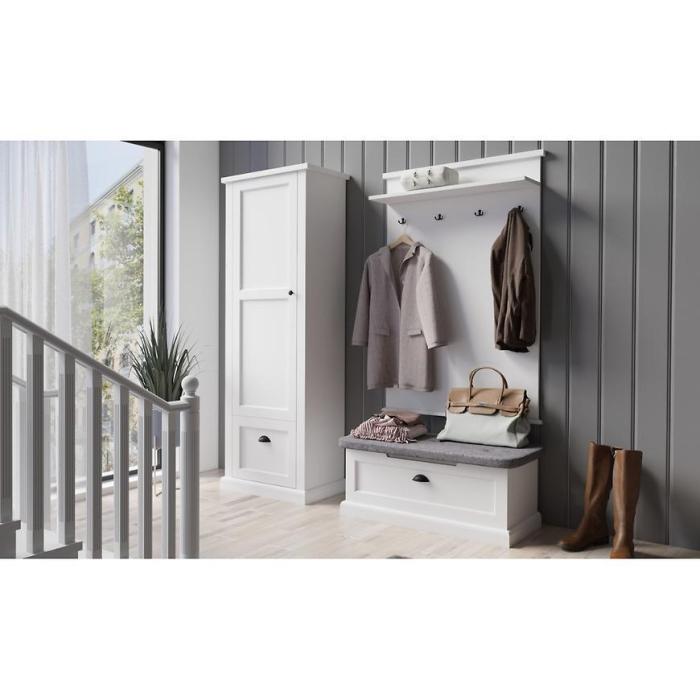 Dzięki uniwersalnej białej kolorystyce panel wpisuje się w różnorodne aranżacje wnętrz – od nowoczesnych po skandynawskie i minimalistyczne. Matowe wykończenie frontów oraz korpusu podkreśla subtelny charakter mebla, a jednocześnie redukuje widoczność odcisków palców i drobnych zabrudzeń.