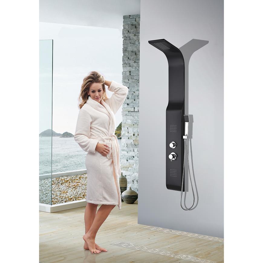 Kolor panelu prysznicowego w kolorze czarnym nadaje mu elegancki i minimalistyczny wygląd, który doskonale pasuje do różnych stylów łazienek. Dodaje to wnętrzu świeżości i harmonii, tworząc idealne miejsce do odpoczynku i relaksu. Ten panel prysznicowy to połączenie nowoczesnego designu, funkcjonalności i wygody, które uczynią Twoje kąpiele niezwykle przyjemnym doświadczeniem.