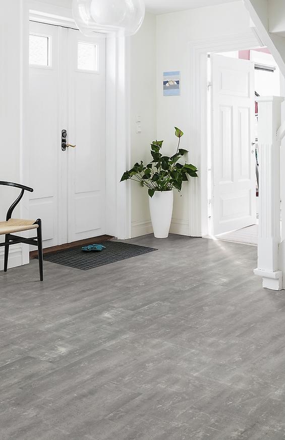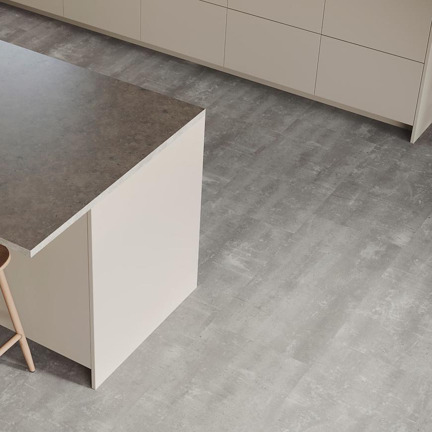 Dekor w kolorze cool grey, imitujący beton, o wzorze płytki i strukturze betonu, nadaje wnętrzu industrialnego charakteru. Struktura betonu w połączeniu z imitacją płytki dodaje podłodze surowego uroku, będąc jednocześnie praktycznym i trwałym rozwiązaniem.