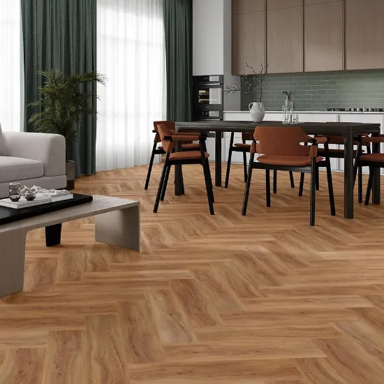 Panel winylowy o wzorze jodełki to idealne rozwiązanie do pomieszczeń o dużym natężeniu ruchu, takich jak biura, kuchnie czy korytarze. Wyróżnia się wyjątkową trwałością dzięki budowie opartej na twardym, ceramicznym rdzeniu SPC oraz grubej warstwie ścieralnej 0,55 mm, co zapewnia mu wysoką klasę użyteczności 23/33. Posiada 4-stronne fazowanie (V-fuga), które podkreśla elegancki, jednoramienny układ desek, nadając podłodze naturalny wygląd drewna.