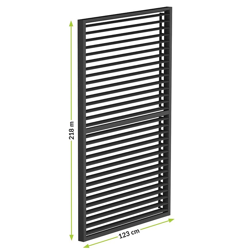 Panel żaluzjowy R Luxe 123 × 218 cm w kolorze antracytowym, wykonany z trwałego aluminium, idealny do pergoli 3 × 4 m. Ruchoma ścianka z regulowanymi lamelami pozwala kontrolować światło i prywatność dzięki technologii LightImpact. Wytrzymały i odporny na warunki atmosferyczne, panel zapewnia elegancki, nowoczesny wygląd przestrzeni ogrodowej. Możliwość montażu do trzech paneli na jednej ścianie pergoli daje elastyczność aranżacji i funkcjonalne zacienienie całej powierzchni.