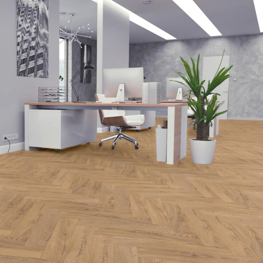 Dekor w postaci dębu nadaje pomieszczeniu naturalny i ciepły charakter, jednocześnie dodając mu elegancji i prestiżu. Wzór paneli w formie jodełki oraz struktura drewna nadają im autentyczności i oryginalności.