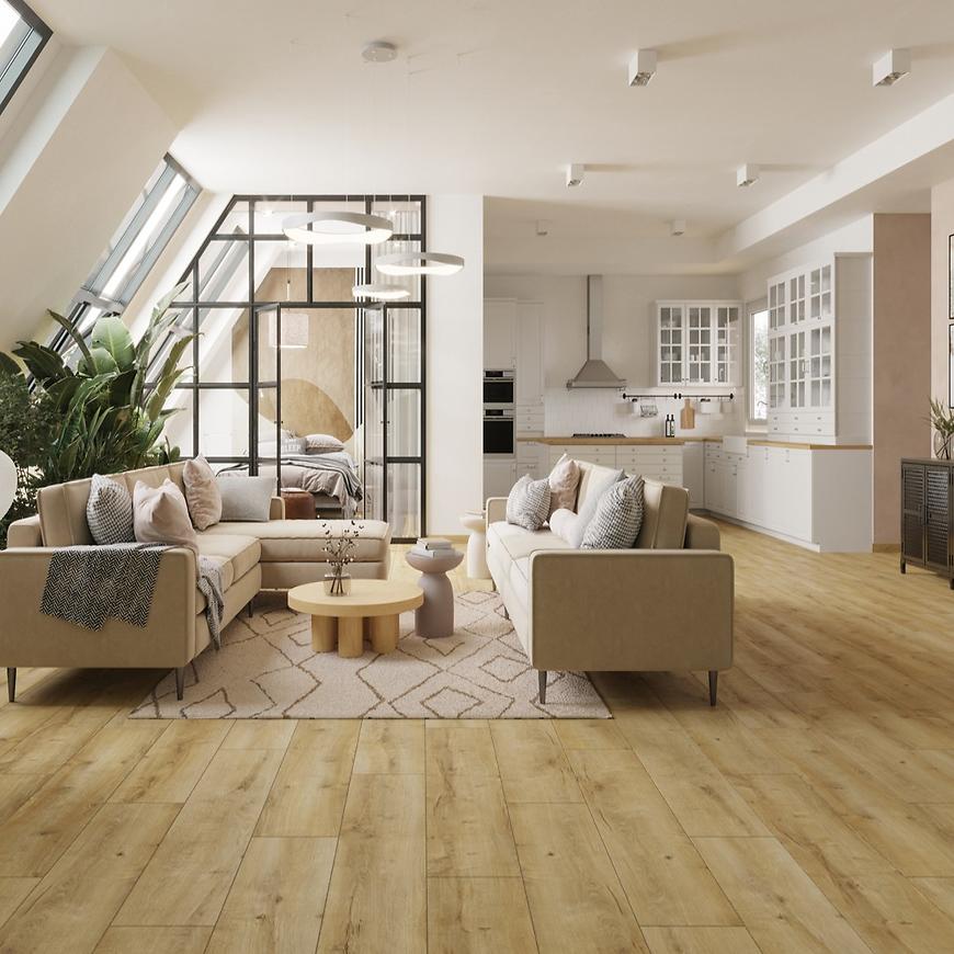 Panele Dąb Matera mają grubość 7 mm oraz szerokość 280 mm, co nadaje podłodze elegancki, nowoczesny wygląd. Naturalna gama kolorystyczna i dekor dębu świetnie komponują się z różnorodnymi stylami wnętrz, dodając im ciepła i harmonii. Struktura drewna oraz szeroka deska podkreślają autentyczność materiału, zapewniając wyjątkowy efekt wizualny.