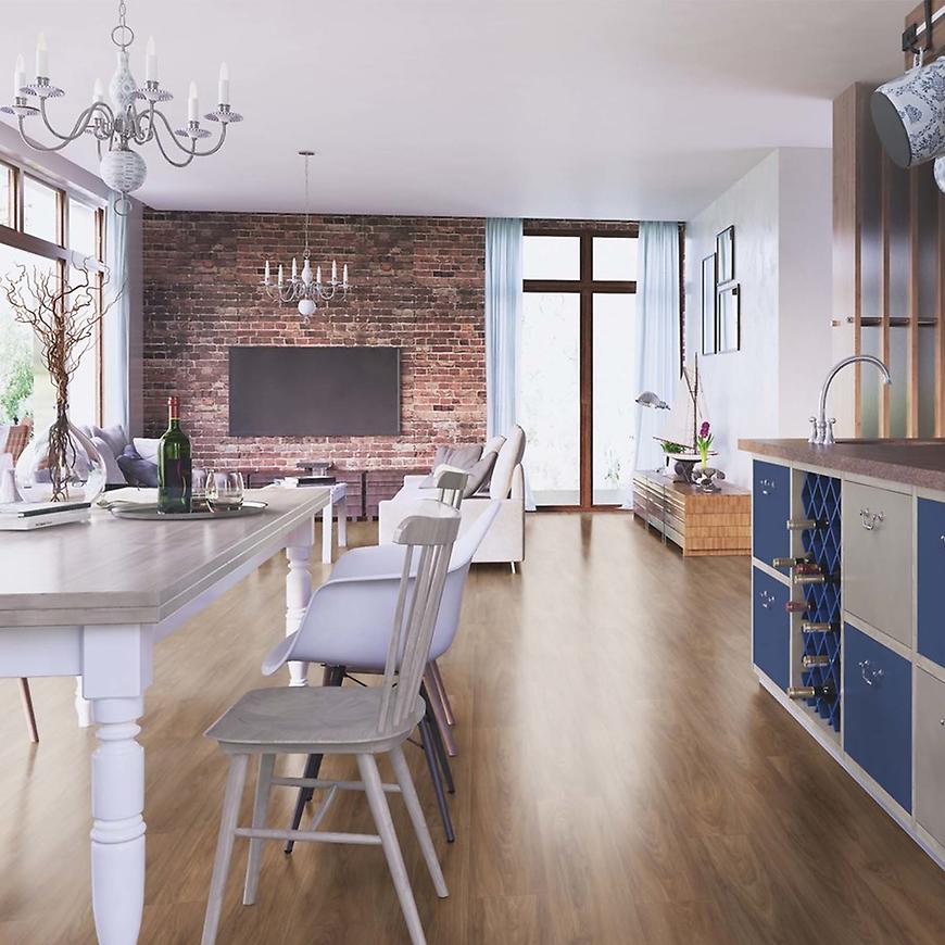 Panele podłogowe wodoodporne, wykonane w kolorze Orzech Atena, to ciekawe i doskonałe rozwiązanie do pomieszczeń intensywnie użytkowanych np: biuro, korytarz, kuchnia. Posiadają standardowy click system przy montażu.
