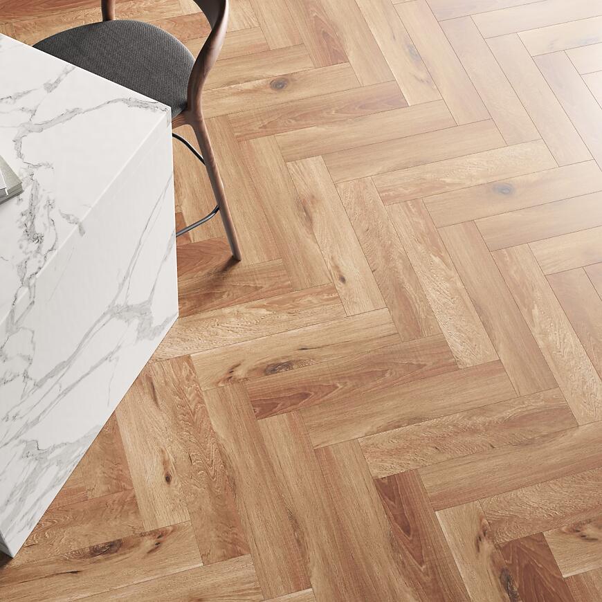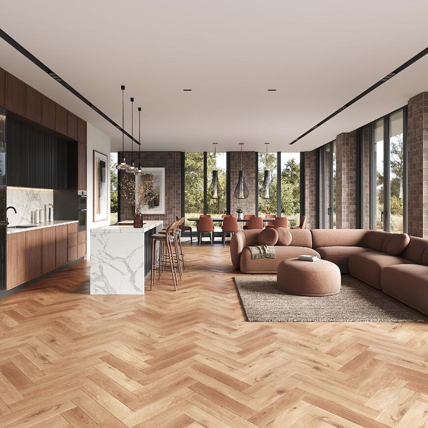 Kolekcja ECONFLOOR wyróżnia się naturalnym dekorem w odcieniu dębu, odwzorowującym strukturę drewna i ułożonym w elegancki wzór jodełki. Panele 1-lamelowe z 4-stronną V-fugą podkreślają charakter każdej aranżacji, nadając jej ponadczasowego stylu. Montaż jest szybki i bezproblemowy dzięki systemowi click 5G, który gwarantuje stabilność i idealne dopasowanie elementów. Dodatkowym atutem paneli jest antypoślizgowość, antystatyczność oraz wysoka klasa odporności ogniowej Bfl-s1, co czyni je bezpiecznym i komfortowym rozwiązaniem na lata.