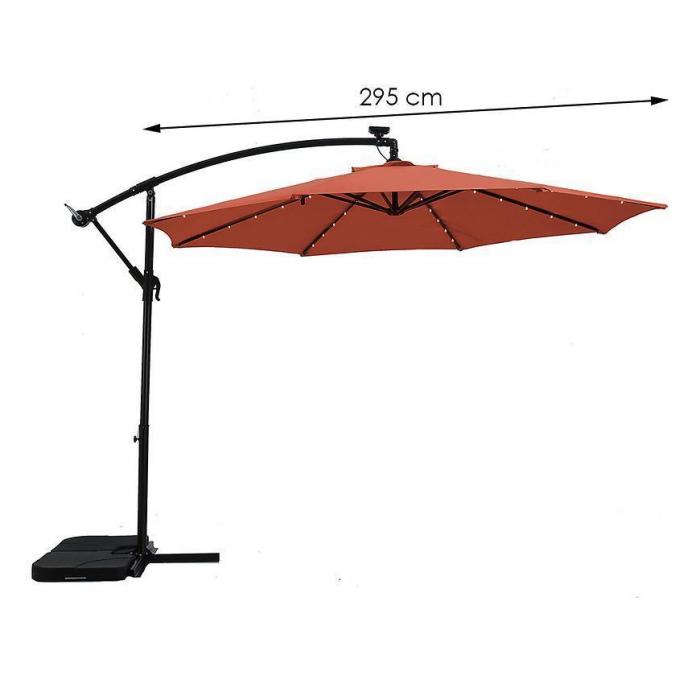 Parasol ogrodowy to idealna propozycja na słoneczne dni na tarasie czy w ogrodzie. Parasol został wyposażony w solarne oświetlenie LED - na każdym żeberku znajduje się 5 lampek. Zaletą produktu jest półautomatyczne rozkładanie oraz wywietrznik. Parasol można ustawić według własnych oczekiwań. Konstrukcja oraz 8 żeber gwarantują stabilność. Parasol wyposażony jest w wysięgnik i bazę krzyżową. Poszycie o gramaturze 160g/m2 zostało wykonane z poliestru, który jest wytrzymały, słabo chłonie wilgoć jest również łatwy w utrzymaniu. W komplecie znajduje się praktyczna torba do przechowywania i transportu.
