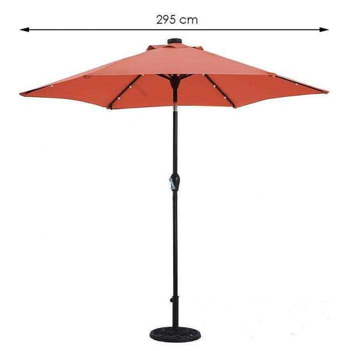 Parasol ogrodowy to idealna propozycja na słoneczne dni na tarasie czy w ogrodzie. Parasol został wyposażony w solarne oświetlenie LED - na każdym żeberku znajdują się 4 lampki. Zaletą produktu jest półautomatyczne rozkładanie oraz wywietrznik. Parasol można ustawić według własnych oczekiwań. Stalowa konstrukcja oraz 6 żeber gwarantują stabilność. Poszycie o gramaturze 160 g/m2 zostało wykonane z poliestru, który jest wytrzymały, słabo chłonie wilgoć jest również łatwy w utrzymaniu. W komplecie znajduje się praktyczna torba do przechowywania i transportu.