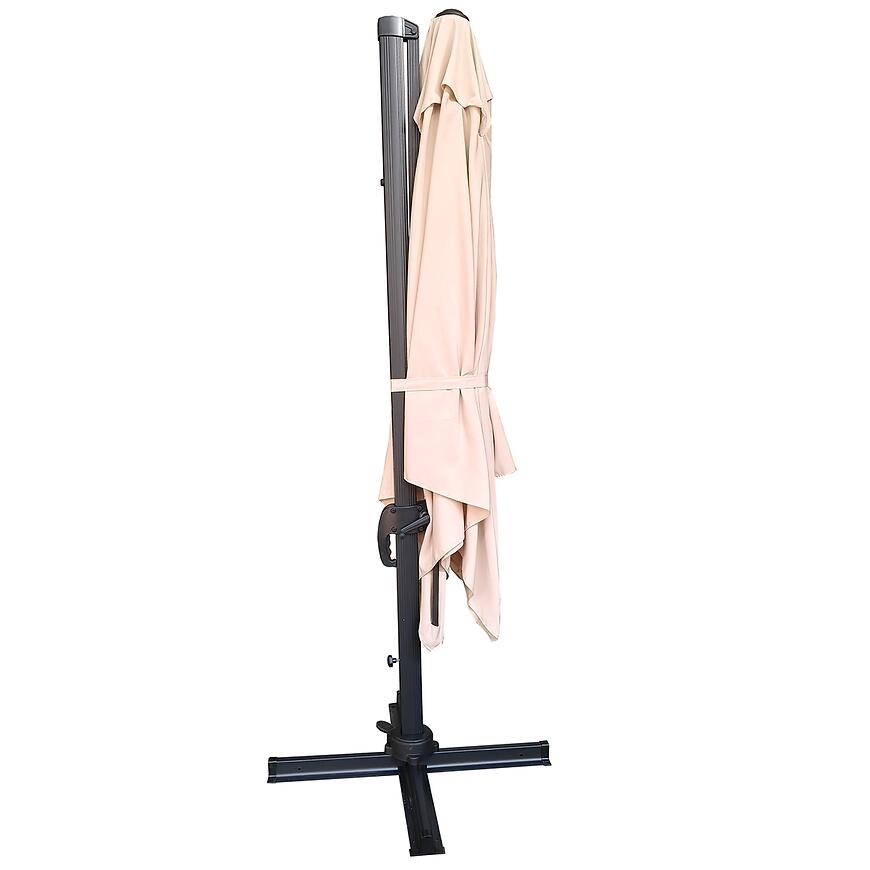 Neutralny beżowy kolor sprawia, że parasol Roma łatwo dopasowuje się do różnych aranżacji przestrzeni zewnętrznych, dodając im lekkości i elegancji.