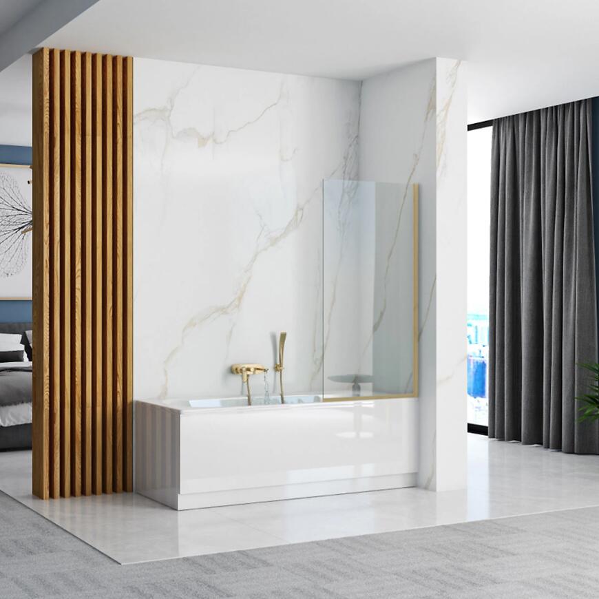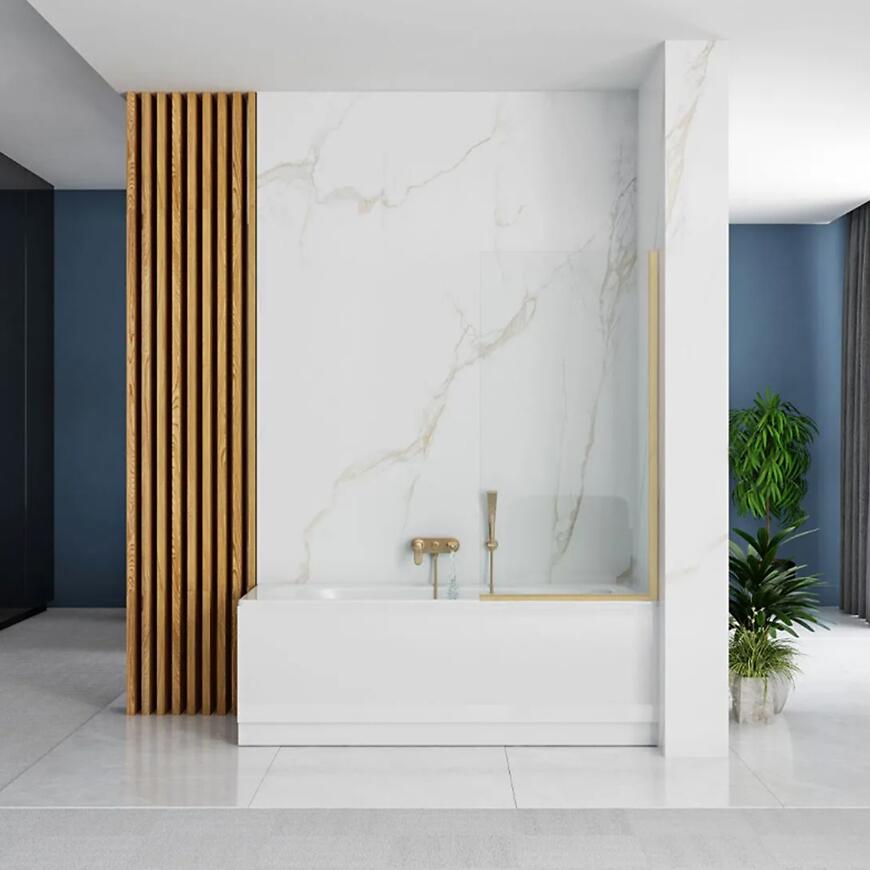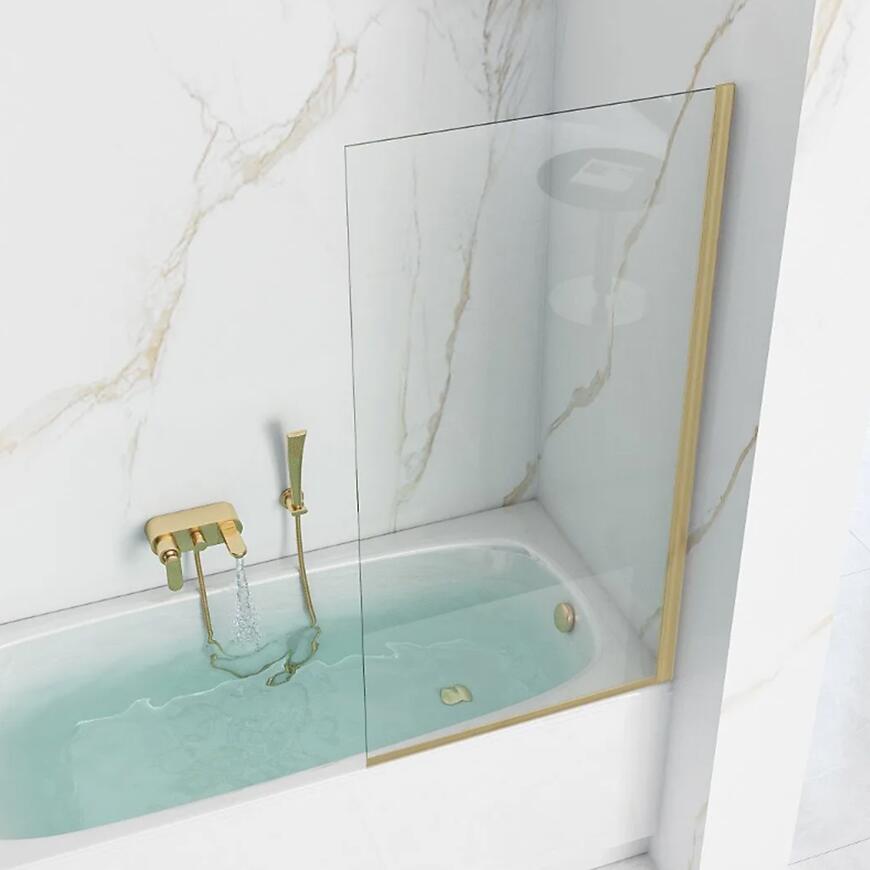 Parawan wannowy Elegant 70x140 gold brush REA – stylowy i funkcjonalny parawan wykonany ze szkła hartowanego 5 mm, o wysokości 140 cm i szerokości 70 cm. Profil w kolorze złotym szczotkowanym, bez regulacji na profilu przyściennym, zapewnia stabilność i nowoczesny design. Waga 12,6 kg, bez powłoki ułatwiającej czyszczenie. Idealny do eleganckich łazienek.
