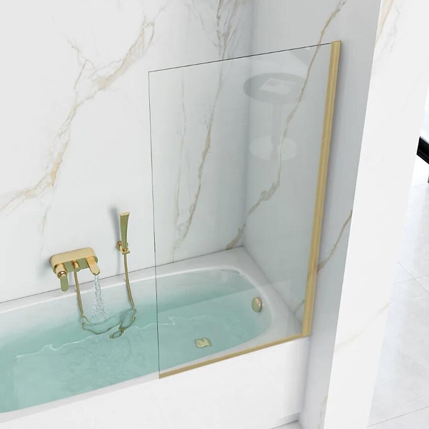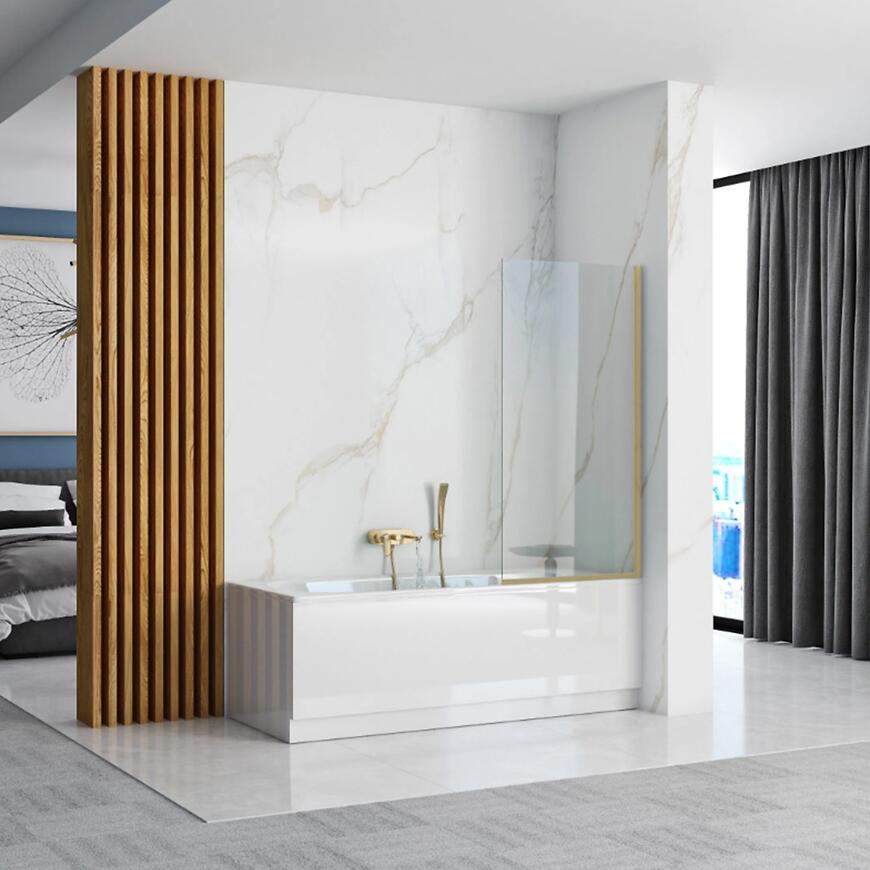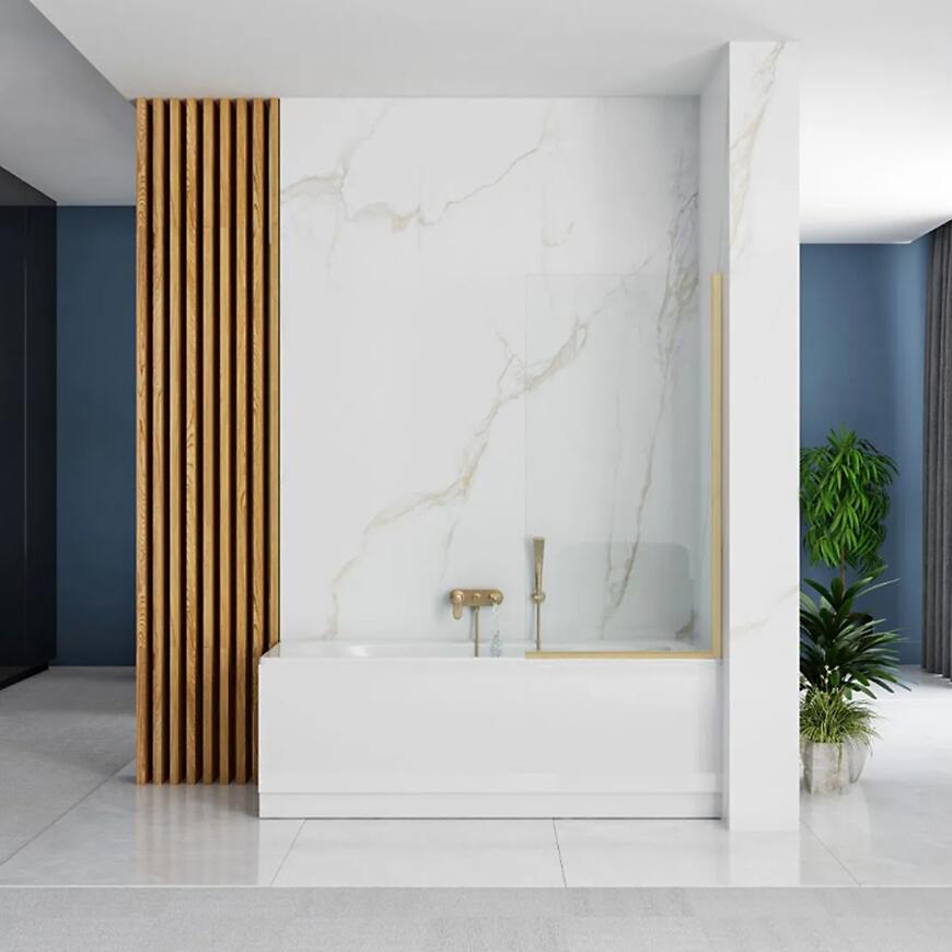 Parawan wannowy Elegant 80x140 gold brush REA – elegancki i funkcjonalny parawan wykonany ze szkła hartowanego 5 mm, o wysokości 140 cm i szerokości 80 cm. Profil w kolorze złotym szczotkowanym, bez regulacji na profilu przyściennym, zapewnia stabilność i nowoczesny design. Waga 14,3 kg, bez powłoki ułatwiającej czyszczenie. Idealny do stylowych i nowoczesnych łazienek.