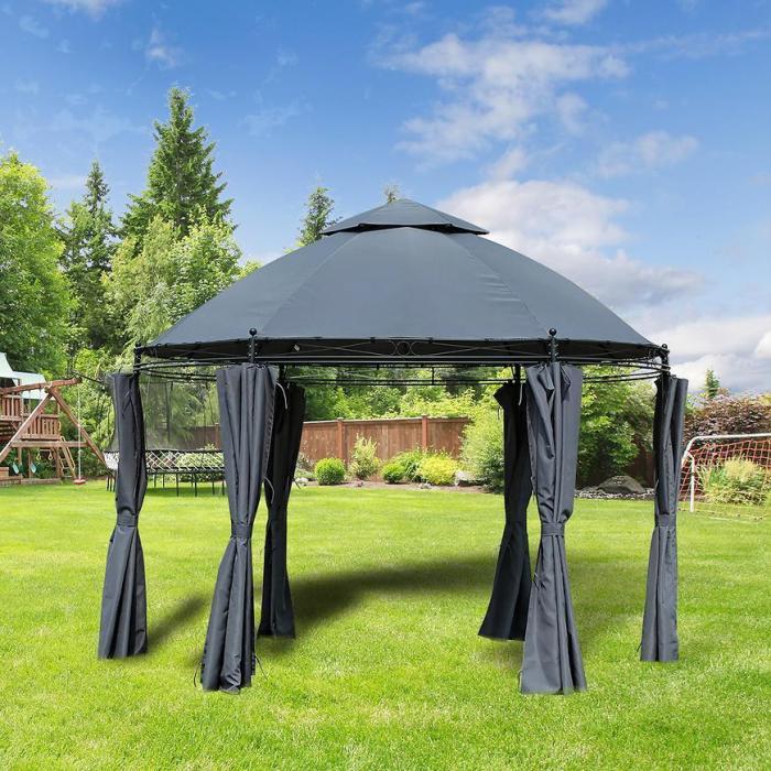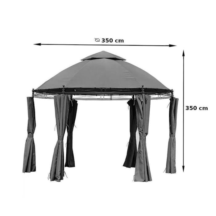 Pawilon ogrodowy okrągły o wymiarach 3,5x3,5 m w praktycznym kolorze szarym będzie idealnym rozwiązaniem na ochronę przed słońcem, a także miejscem na chwilę odpoczynku. To prosty sposób na zadaszenie tarasu, ogrodu, czy też miejsca, w którym odpoczywamy.