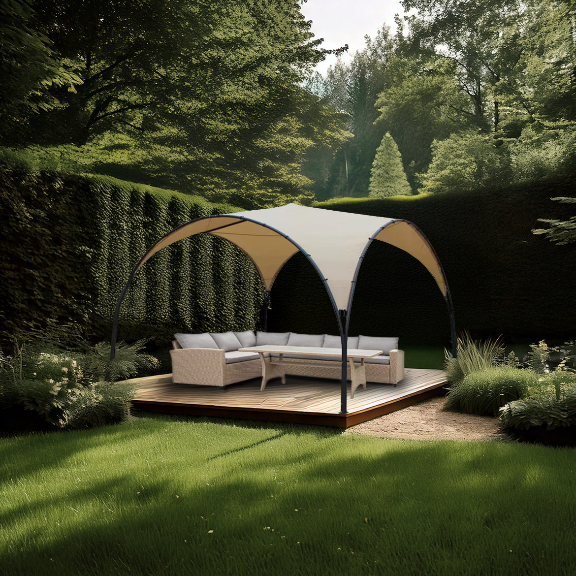 Altana ogrodowa pełni funkcję zadaszenia przed słońcem, umożliwiając korzystanie z przestrzeni na świeżym powietrzu. Jego uniwersalny kolor beżowy doskonale komponuje się z otoczeniem, dodając przytulności i elegancji otoczeniu.