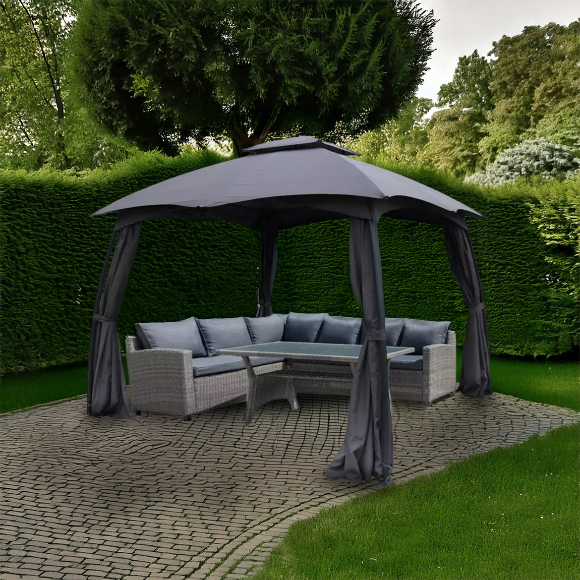 Grafitowy kolor altany sprawia, że doskonale komponuje się z różnorodnym stylem ogrodu, dodając mu subtelnego uroku i elegancji. To praktyczne i estetyczne rozwiązanie, które pozwoli cieszyć się letnimi dniami w komfortowych warunkach, zapewniając jednocześnie przytulną atmosferę i wygodę dla wszystkich użytkowników.