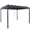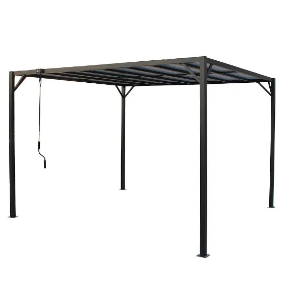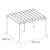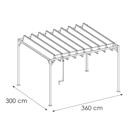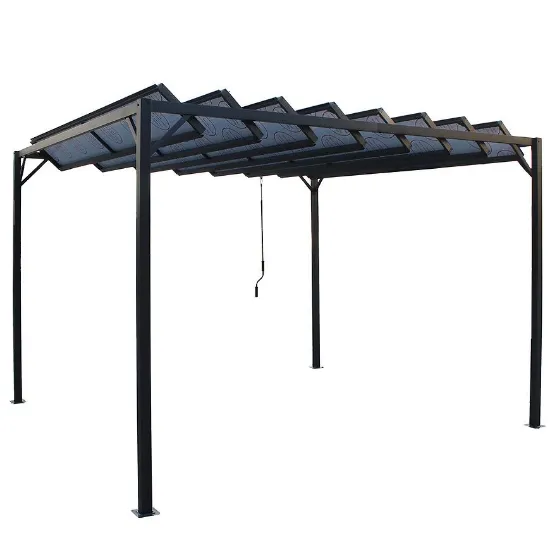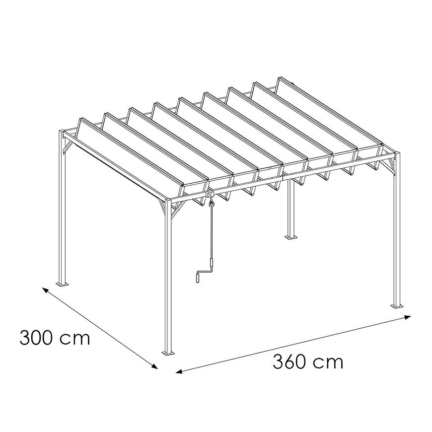 Pawilon typu pergola posiada prostokątny dach z wytrzymałego poliwęglanu, który chroni przed promieniowaniem UV oraz lekkim deszczem. Ruchome panele o grubości 6 mm umożliwiają regulację dostępu światła, a pojedynczy panel dachowy o wymiarach 45x20 mm gwarantuje stabilność konstrukcji.