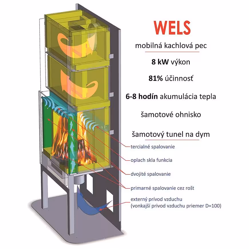 Piec Wels został zaprojektowany z myślą o Twoim komforcie. Wyposażony w regulację szybkości spalania, deflektor spalin, miejsce na drewno pod paleniskiem oraz wyjmowany popielnik, zapewnia łatwą obsługę, konserwację i wygodne przechowywanie opału. Farba żaroodporna, używana do powłoki pieca, zapewnia trwałość i estetyczny wygląd.