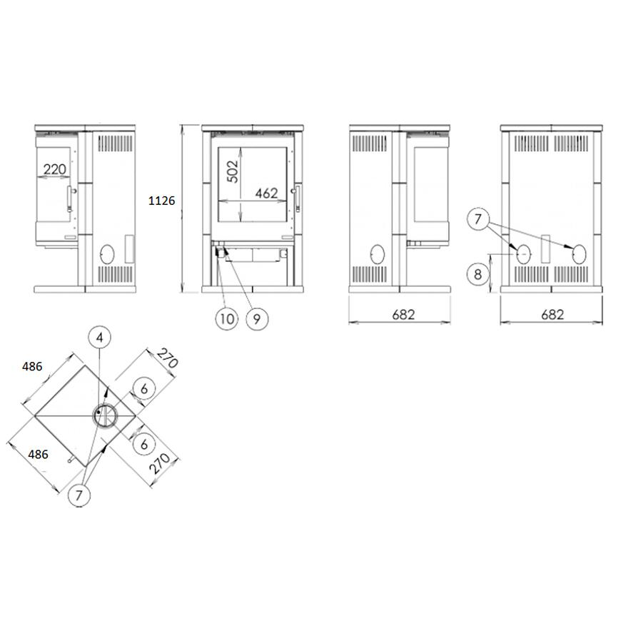 Piec kominkowy wolnostojący Admiral Mastek wyposażony jest w dolot powietrza fi 100 mm, co umożliwia doprowadzenie powietrza z zewnątrz i stabilną pracę w domach z wentylacją mechaniczną. Regulacja szybkości spalania pozwala precyzyjnie kontrolować intensywność ognia i temperaturę w pomieszczeniu. Frontowy załadunek opału oraz drzwi otwierane w lewo ułatwiają codzienną obsługę, a wyjmowany popielnik znacząco skraca czas czyszczenia. Pod paleniskiem znajduje się praktyczne miejsce na drewno, które poprawia ergonomię użytkowania i pozwala przechowywać opał w zasięgu ręki.