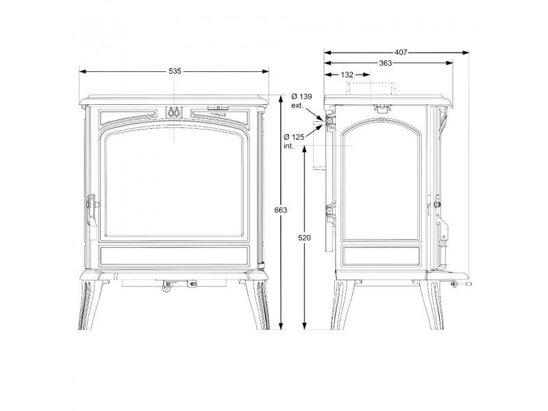 Piec kominkowy ma wysokość 663 mm z możliwością podwyższenia do 730 mm, szerokość 535 mm oraz głębokość 407 mm. Waga 135 kg świadczy o solidnej, żeliwnej konstrukcji. Przyłącze spalin może być górne lub tylne, co ułatwia dopasowanie do istniejącej instalacji kominowej. Średnica wylotu spalin wynosi 130 mm. Średnia temperatura spalin osiąga 332°C, a zalecany ciąg kominowy mieści się w zakresie 12–14 Pa. Duża szyba o wymiarach 404 × 326 mm umożliwia dobrą widoczność paleniska.