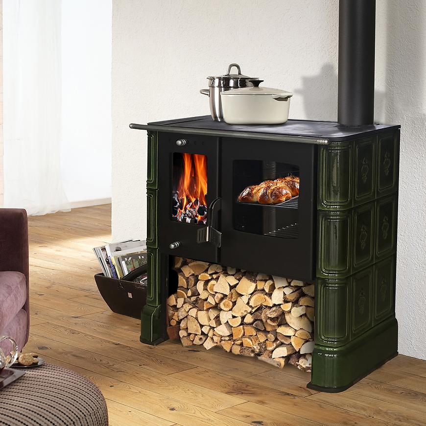 Piec stalowo kaflowy Steyr Sparherd Glassgreen umożliwia pieczenie i gotowanie potraw. Posiada ceramiczną pokrywę. Do palenia w piecu można używać drewna lub brykietu drzewnego. Pod paleniskiem znajduje się łatwo dostęne miejsce do przechowywania drewna. Drzwiczki otwierane na lewą stronę, piec posiada wyjmowany popielnik. Piec wykonany ze stali, boki obłożone kaflami w kolorze zielonym. Produkt spełnia normy Ecodesign 2022 - jest zgdny z ekoprojektem oraz posiada certyfikat CE.