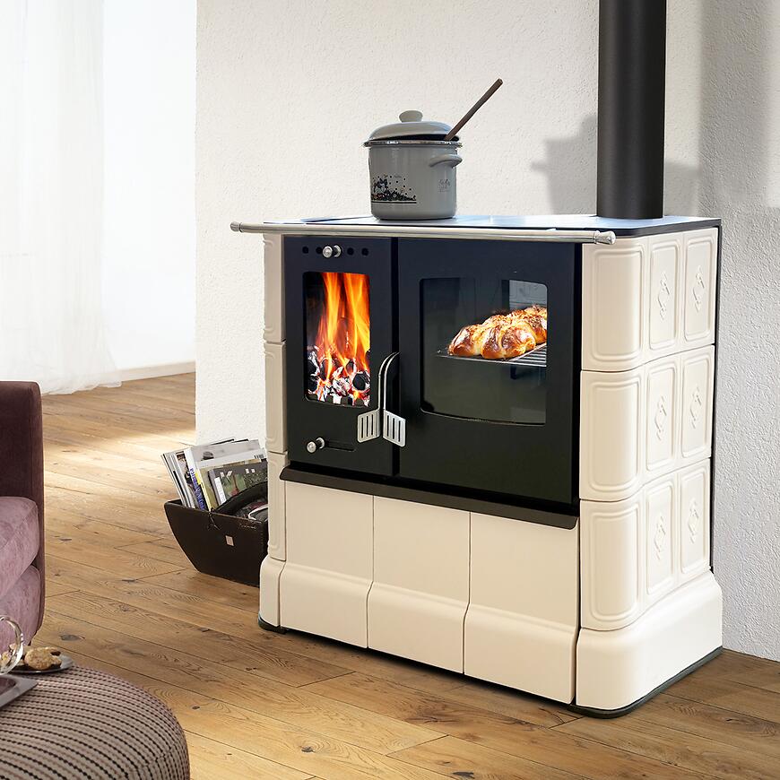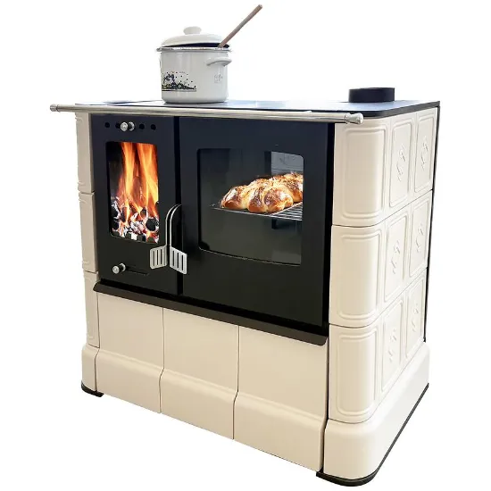 Dużym atutem jest płyta grzewcza z fajerką, która umożliwia gotowanie i podgrzewanie potraw bez użycia energii elektrycznej. Załadunek paliwa odbywa się z przodu, a drzwi otwierane w lewo ułatwiają obsługę. Pod paleniskiem przewidziano praktyczne miejsce na drewno, co poprawia komfort codziennego użytkowania. Wyjmowany popielnik usprawnia czyszczenie urządzenia.