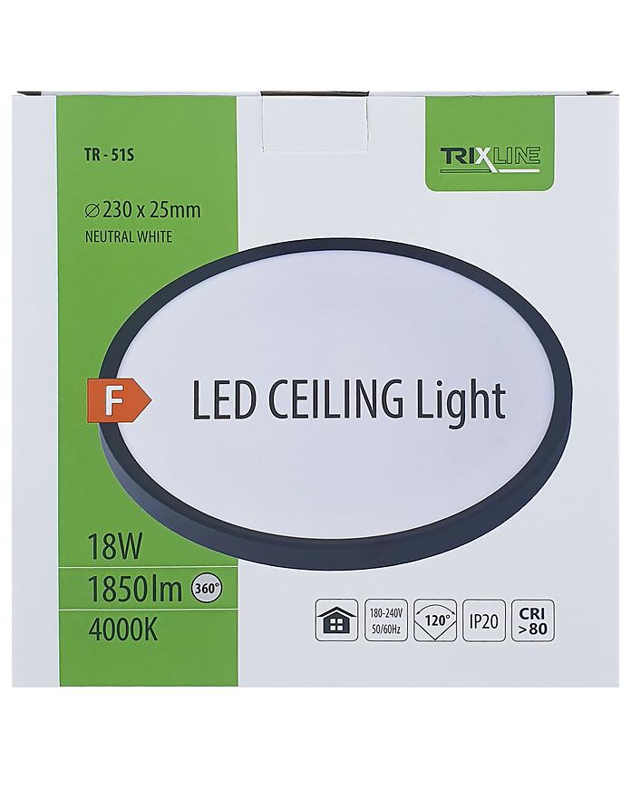 Plafon LED TR-51S 18 W 4000 K czarny to kompaktowe, nowoczesne oświetlenie z neutralną barwą światła. Wykonany z trwałego plastiku, z zintegrowanym źródłem LED o mocy 18 W. Nieprzyciemnialny i bez możliwości zmiany kierunku światła. Zasilanie 230 V, klasa szczelności IP20, klasa ochronności II, wysokość 2,5 cm, średnica 23 cm, efektywność energetyczna F.