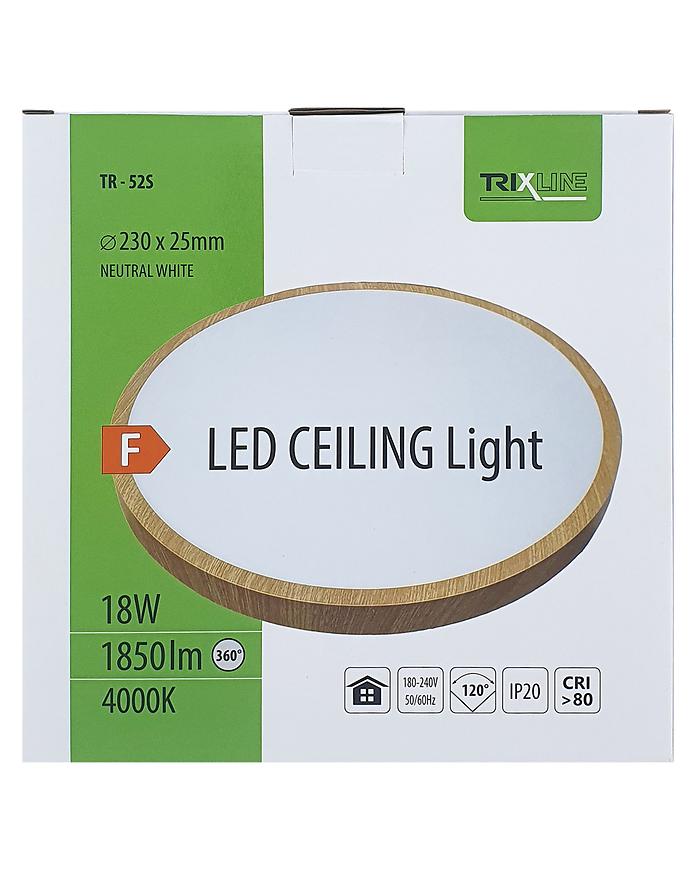 Plafon LED TR-52S 18 W 4000 K w kolorze dąb to eleganckie i kompaktowe oświetlenie sufitowe. Wykonany z trwałego plastiku, posiada zintegrowane źródło LED o mocy 18 W, emitujące neutralną białą barwę światła. Nieprzyciemnialny, bez możliwości zmiany kierunku światła. Zasilanie 230 V, klasa szczelności IP20, klasa ochronności II, wysokość 2,5 cm, średnica 23 cm, efektywność energetyczna F. Idealny do wnętrz, gdzie liczy się subtelny design i energooszczędność.