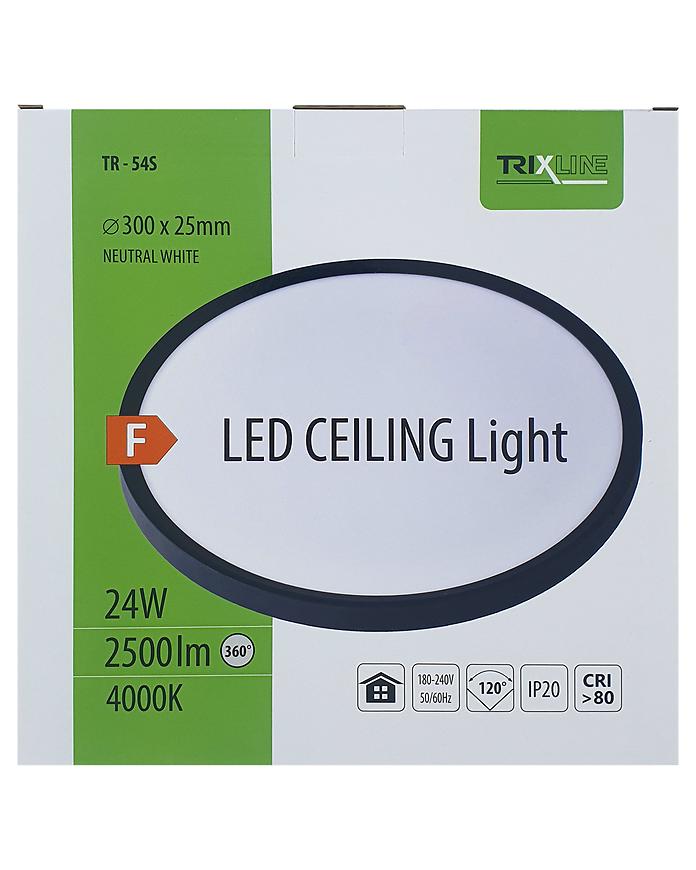 Plafon LED TR-54S o mocy 24W emituje neutralne białe światło (4000K), idealne do równomiernego oświetlenia wnętrz. Wykonany z czarnego tworzywa sztucznego, wyposażony w zintegrowane źródło LED, zapewnia energooszczędność i długą żywotność. Plafon posiada klasę ochronności II oraz IP20, a jego kompaktowa wysokość 2,5 cm i średnica 30 cm sprawiają, że doskonale sprawdzi się w nowoczesnych aranżacjach.