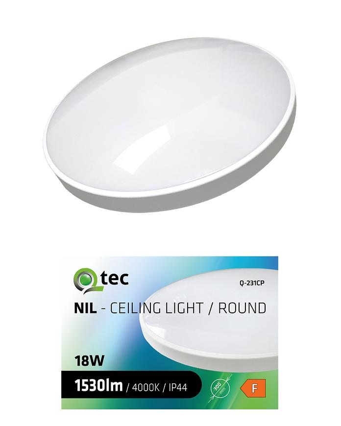 Plafon QTEC o mocy 18W emituje neutralne białe światło (4000K) o strumieniu 1530 lm, zapewniając jasne i komfortowe oświetlenie. Wykonany z plastiku w białym kolorze, wyposażony w zintegrowane źródło LED. Dzięki klasie szczelności IP44 doskonale nadaje się zarówno do salonu, sypialni, jak i do łazienki. Średnica plafonu wynosi 30 cm. Produkt energooszczędny, nieprzyciemnialny.