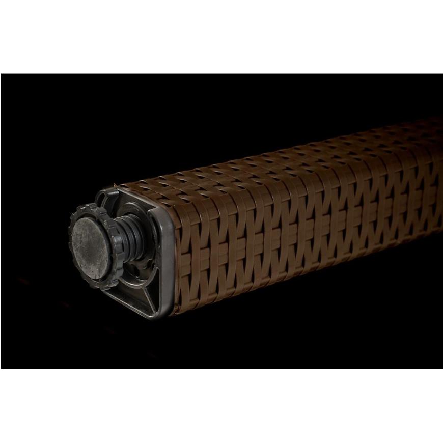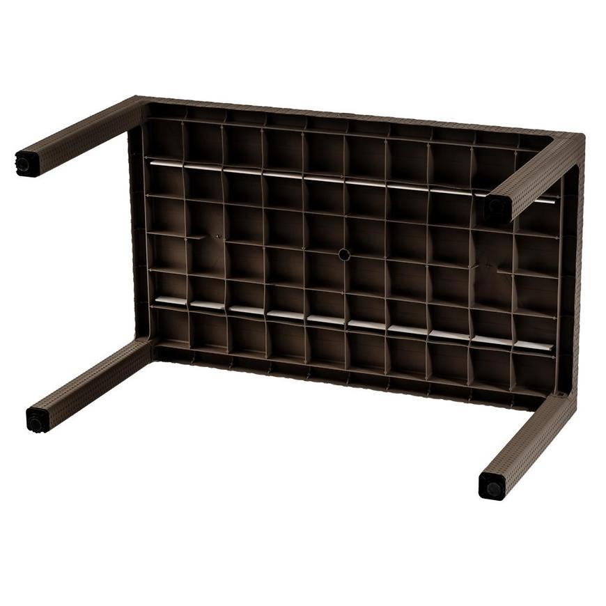 Stół został wykonany z trwałego plastiku, zarówno blat jak i stelaż, co gwarantuje odporność na warunki atmosferyczne oraz łatwość w utrzymaniu czystości. Kolor brązowy nadaje mu uniwersalny charakter, który świetnie komponuje się z różnorodnymi aranżacjami ogrodowymi.