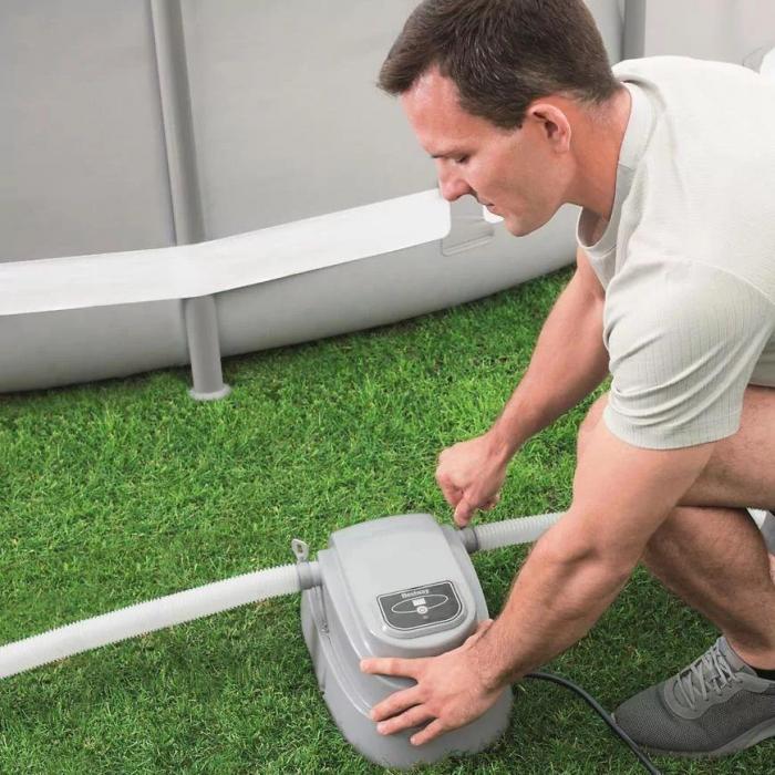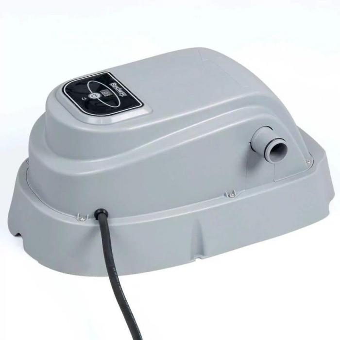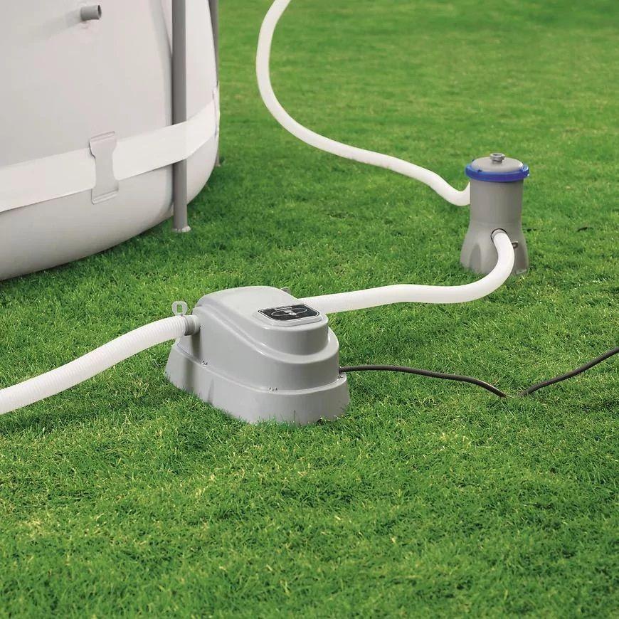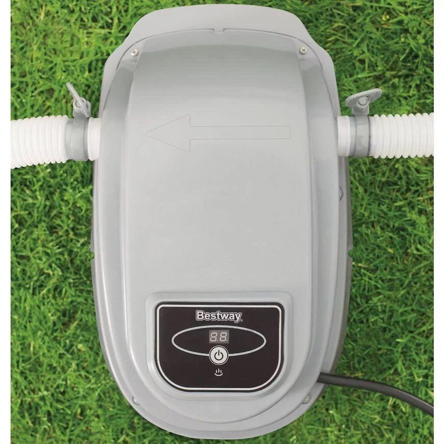To cyfrowo sterowany ogrzewacz basenowy z membranowym panelem sterowania, posiada czujnik przepływu wody gwarantujący wysoki poziom ochrony. Ogrzewacz basenowy jest wyposażony w przenośny wyłącznik przepływu prądu na prąd zmienny nieprzekraczającym 10 Ma. Maksymalna moc grzejąca to 40°C (104°F). Zewnętrzny podgrzewacz basenu jest idealny do stosowania z basenami Bestway® o średnicy 457cm lub mniejszej. Elektryczny podgrzewacz basenowy ma dwa wyloty węży, z których jeden łączy się z pompą filtrującą, a drugi z basenem naziemnym. Czysta, świeża i nieskazitelna woda jest pompowana do podgrzewacza basenowego naziemnego za pośrednictwem pompy filtracyjnej, gdzie jest następnie podgrzewana i pompowana z powrotem do basenu.