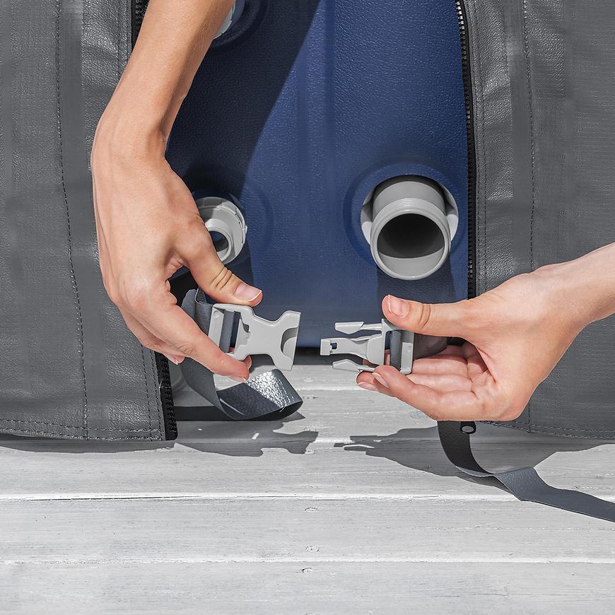 - Praktyczne zamknięcie na zamek błyskawiczny – umożliwia łatwe podłączenie zarówno wbudowanej pompy, jak i pompy zewnętrznej.
