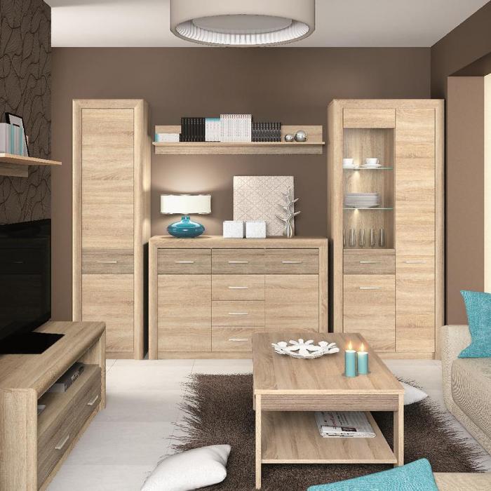 Kolekcja mebli Castel to wyjątkowa propozycja dla osób poszukujących nowoczesnego i funkcjonalnego wyposażenia do swojego pokoju dziennego. Wszystkie meble z tej kolekcji wykonane są z wysokiej jakości płyty wiórowej laminowanej, co gwarantuje trwałość i solidność konstrukcji. Kolekcja Castel dostępna jest w eleganckim dekorze dąb sonoma, który doskonale współgra z elementami w kolorze trufli, dodając wnętrzu przytulnego i naturalnego charakteru.