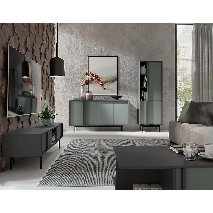 Kolekcja Alsy to propozycja dla osób, które chcą nadać swojemu pokojowi dziennemu wyjątkowy charakter. Połączenie głębokiego zielonego odcienia aloes na frontach z eleganckim antracytem korpusów tworzy wyrazisty kontrast, który staje się centralnym punktem aranżacji. Minimalistyczne formy, matowe wykończenie oraz solidne, wysokie metalowe nóżki sprawiają, że meble prezentują się nowocześnie, a jednocześnie lekko.