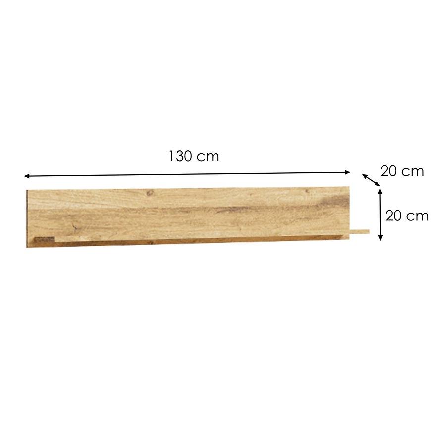 Półka ma wymiary 130 cm szerokości, 20 cm wysokości i 20 cm głębokości, dzięki czemu oferuje praktyczne miejsce do przechowywania różnych drobnych przedmiotów.
