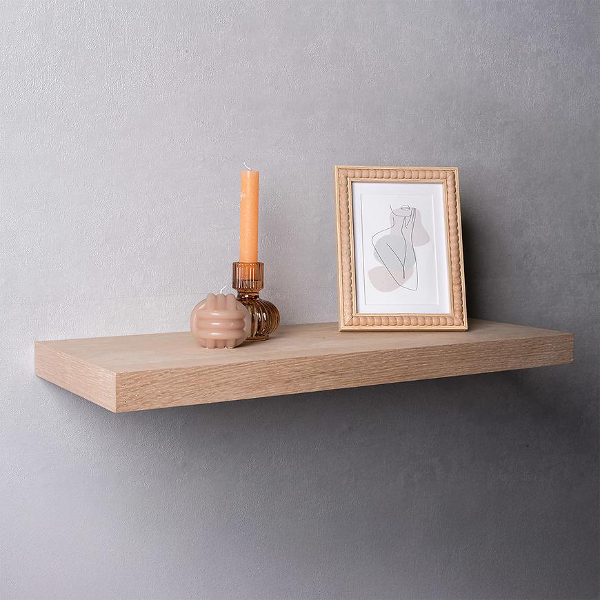Półka wisząca w kolorze dąb z materiału wykonania z płyty wiórowej laminowanej. Idealna do nowoczesnych wnętrz, półka ta oferuje funkcjonalność i elegancję. Doskonale komponuje się z różnorodnymi stylami aranżacyjnymi, zapewniając zarazem trwałość i łatwość w utrzymaniu czystości. Idealna na książki, ozdoby czy drobne przedmioty.