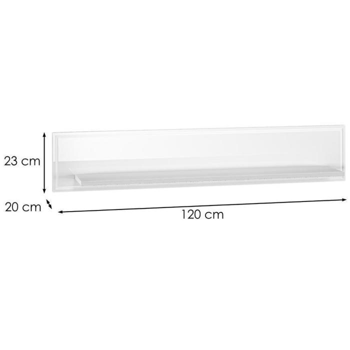 Półka z kolekcji Goldin to przede wszystkim praktyczny i funkcjonalny mebel. Wygląd półki jest glamour. Półka została wykonana z płyty wiórowej laminowanej w kolorze białym połysk, na których można postawić ramki ze zdjęciami lub ozdobne figurki. Sprawdzi się przede wszystkim w salonie, pokoju dziennym, a także w innych dowolnych pomieszczeniach.