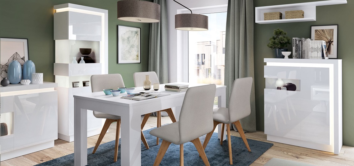 Fronty szafy 4-drzwiowej oraz komody z szufladami mają połyskowe wykończenie, które dodaje elegancji i luksusowego charakteru. Z kolei korpus mebli utrzymany jest w matowej bieli, dzięki czemu kolekcja wygląda minimalistycznie i nowocześnie. Pozostałe fronty – m.in. łóżka i szafek – zostały wykończone w macie, co subtelnie kontrastuje z połyskiem i tworzy wysmakowaną, stonowaną kompozycję.