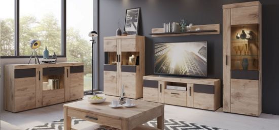 Wykończenie w dekorze Dąb Viking nadaje meblom Grano ciepły, przytulny charakter, który świetnie współgra z domową atmosferą. Jasne drewno wzbogacono o subtelne detale w głębokim, grafitowym odcieniu – ten kontrast sprawia, że kolekcja prezentuje się nowocześnie, a zarazem przyjemnie dla oka. Naturalna kolorystyka mebli ułatwia dopasowanie ich do różnych stylów wnętrz – zarówno tych pełnych wyrazistych kolorów, jak i opartych na delikatnych, pastelowych tonacjach.