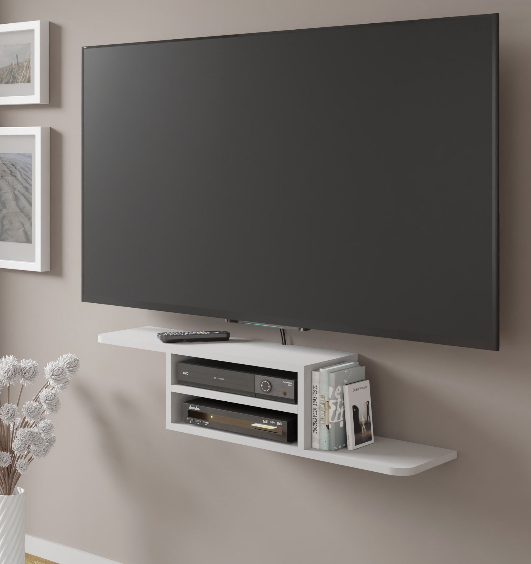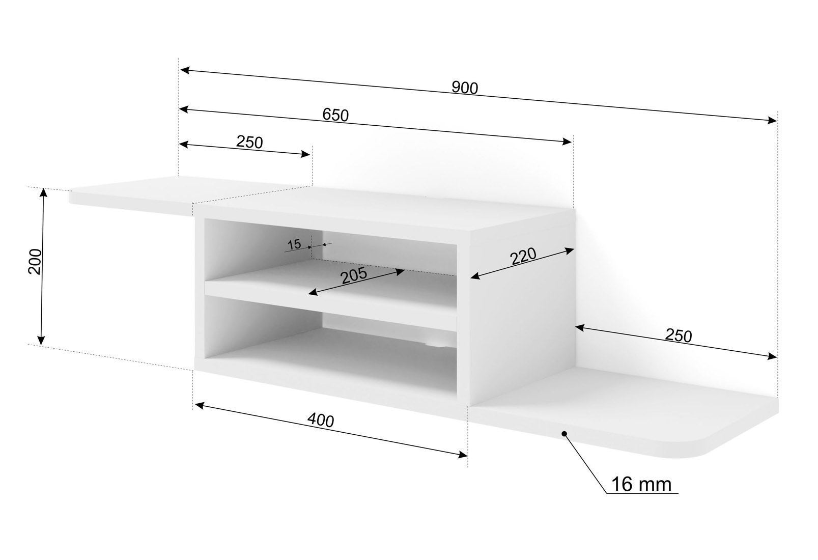 Półka Ikar została zaprojektowana z myślą o praktycznym wykorzystaniu każdego centymetra. Dwie wnęki w środkowej części umożliwiają przechowywanie różnorodnych urządzeń multimedialnych, pilotów, książek czy dekoracji, nadając jednocześnie porządek wokół telewizora. Dwa otwory na kable ułatwiają organizację przewodów, co z kolei pozwala zachować estetyczny wygląd przestrzeni.