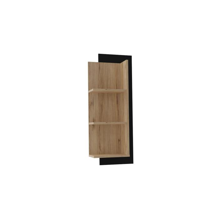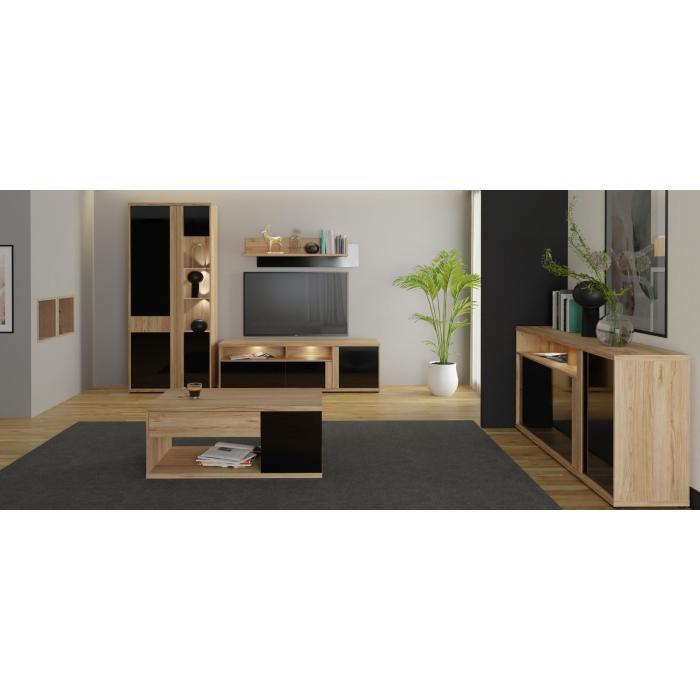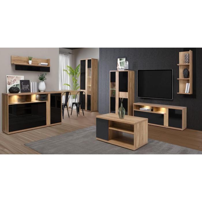 System Islanti wykonany w wybarwieniu dąb catania z frontami w czarnym połysku. Bryły można ustawić w pokoju dziennym oraz jadalni urządzonej w nowoczesnym stylu. Przez błyszczące fronty można łączyć zabudowę z efektownymi dodatkami w stylu glamour. Na uwagę zasługują pionowe listwy służące za uchwyty, pogrubiany blat i solidna konstrukcja. Jednak to wyposażenie sprawia, że jest to mebel premium. Doskonały styl podkreśla efektowne oświetlenie (opcja dodatkowo płatna), natomiast mechanizm "push to open" ułatwia dostęp do zawartości szuflad.