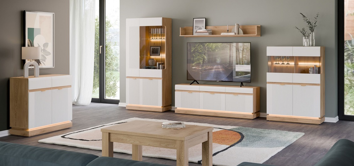 Opcjonalne oświetlenie LED, dostępne m.in. w przeszklonych witrynach, nie tylko eksponuje zawartość mebli, ale także tworzy nastrojową atmosferę, idealną do wieczornego relaksu. Dyskretne podświetlenie podkreśla nowoczesny charakter kolekcji i dodaje wnętrzom przytulności.