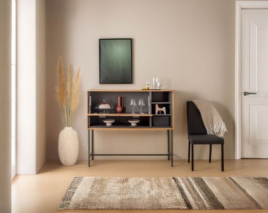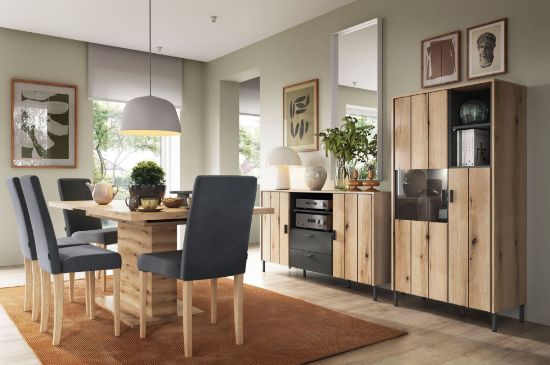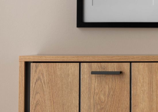 Kolekcja Shirley Dąb to wyjątkowa linia mebli przeznaczona do aranżacji salonów i jadalni, w której prostota formy łączy się z nowoczesnym akcentem industrialnym. Naturalny odcień drewna w ciepłej tonacji dębu, ryflowane fronty z subtelnym, czarnym nadrukiem oraz antracytowe detale tworzą wyrazisty, a zarazem uniwersalny zestaw, który odnajdzie się w wielu stylach wnętrzarskich – od loftowego, przez eklektyczny, po boho czy vintage.