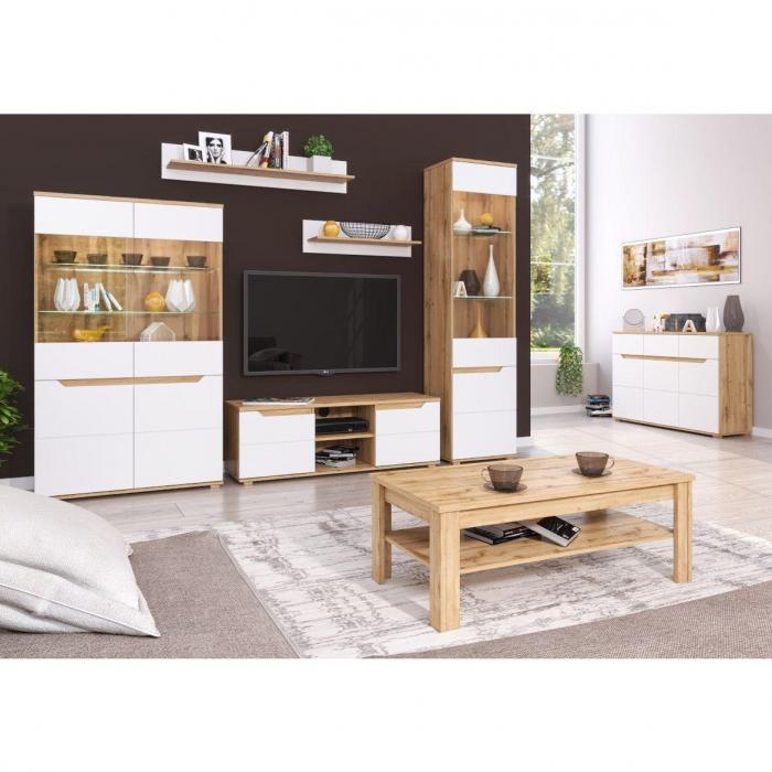 W skład kolekcji Vincent wchodzi kilka różnorodnych elementów, które umożliwiają tworzenie praktycznych i estetycznych układów w salonie. Komoda dwudrzwiowa oraz komoda dwudrzwiowa z czterema szufladami to wszechstronne meble do przechowywania, które mogą pomieścić zarówno większe, jak i mniejsze przedmioty. Ława z dodatkową półką do przechowywania pod blatem to idealne miejsce na przechowywanie mediów czy innych akcesoriów, które chcemy mieć pod ręką. Półki ścienne wiszące umożliwiają wyeksponowanie książek, dekoracji czy zdjęć, tworząc spersonalizowaną przestrzeń. Szafka RTV jednodrzwiowa i witryny dwudrzwiowe - zarówno wysoka, jak i niska - to rozwiązania na przechowywanie sprzętu multimedialnego oraz innych niezbędnych elementów. Ich wyjątkowy wygląd sprawia, że stanowią zarówno funkcjonalne, jak i dekoracyjne akcenty w pomieszczeniu.